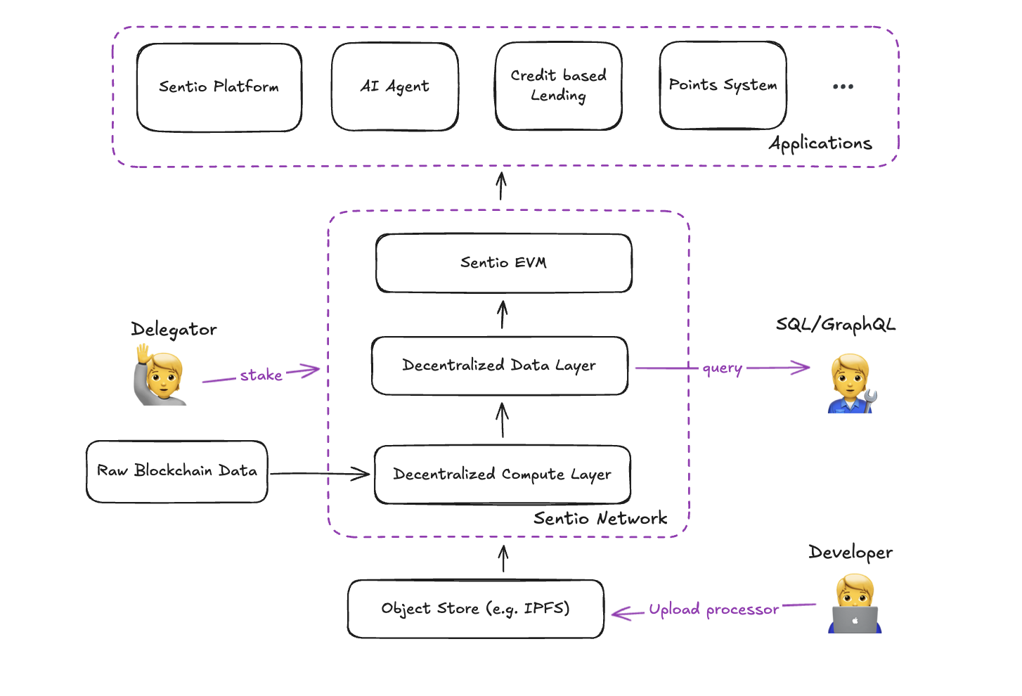 Sentio Network extends the Sentio platform by moving its storage and processor layers into a decentralized network. Instead of being operated by a single service provider, data storage and processor execution are handled by a distributed set of network participants. This enables verifiable data pipelines and aligned incentives for node operators, developers, and end-users โ while preserving the developer experience and tooling that have made Sentio widely adopted.