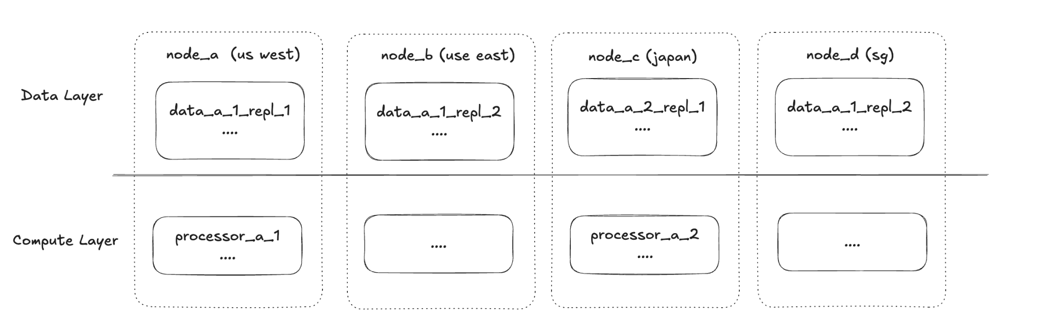 The Compute Layer and Data Layer can scale independently. For example, a processor might have two replicas running on different continents. Data generated by each processor can also be replicated to different nodes in nearby locations, even if those nodes are not running that specific processor. This design offers maximum flexibility in terms of availability and cost.